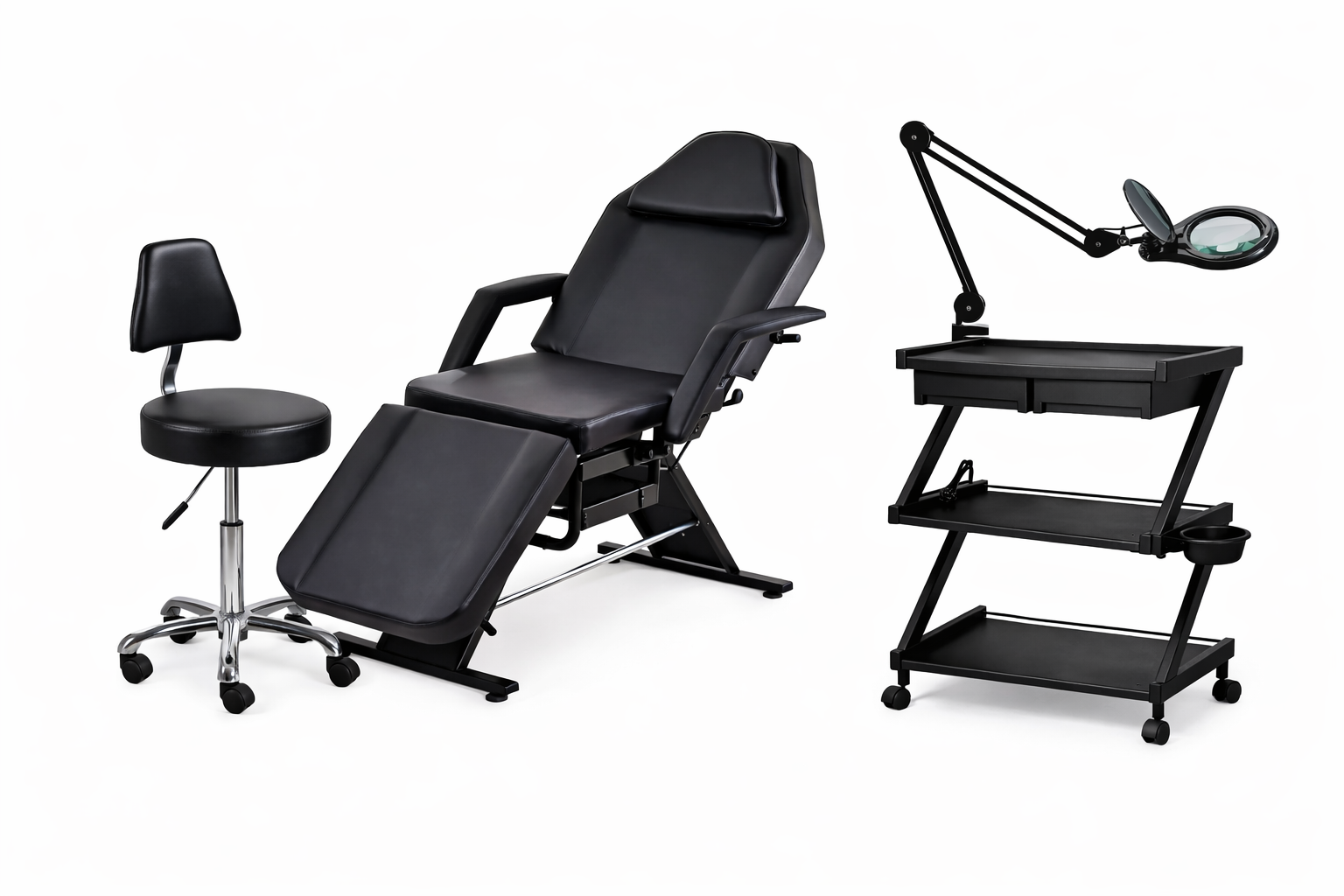 הסט כולל מיטת טיפולים מתכווננת, כיסא קוסמטיקה נוח, עגלה מקצועית לאחסון ציוד ומנורת זכוכית מגדלת עם תאורה, כולם בעיצוב מודרני בצבע שחור.