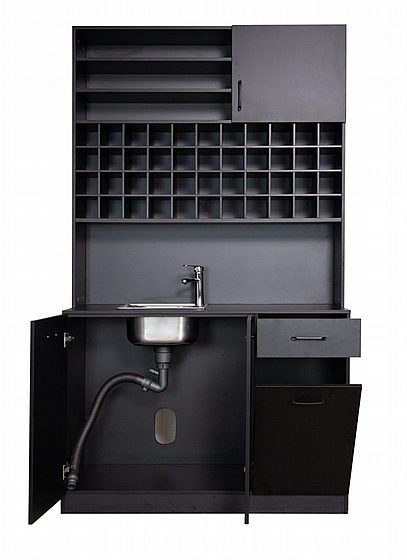 משלב כיור מובנה, מידוף רחב ופתרונות אחסון חכמים לעבודה נוחה, מסודרת ויעילה. המטבחון תוכנן במיוחד לעמדות צבע במספרות ומאפשר גישה נוחה לצבעי שיער, חומרים, כלי עבודה ואביזרים – הכל במקום אחד.