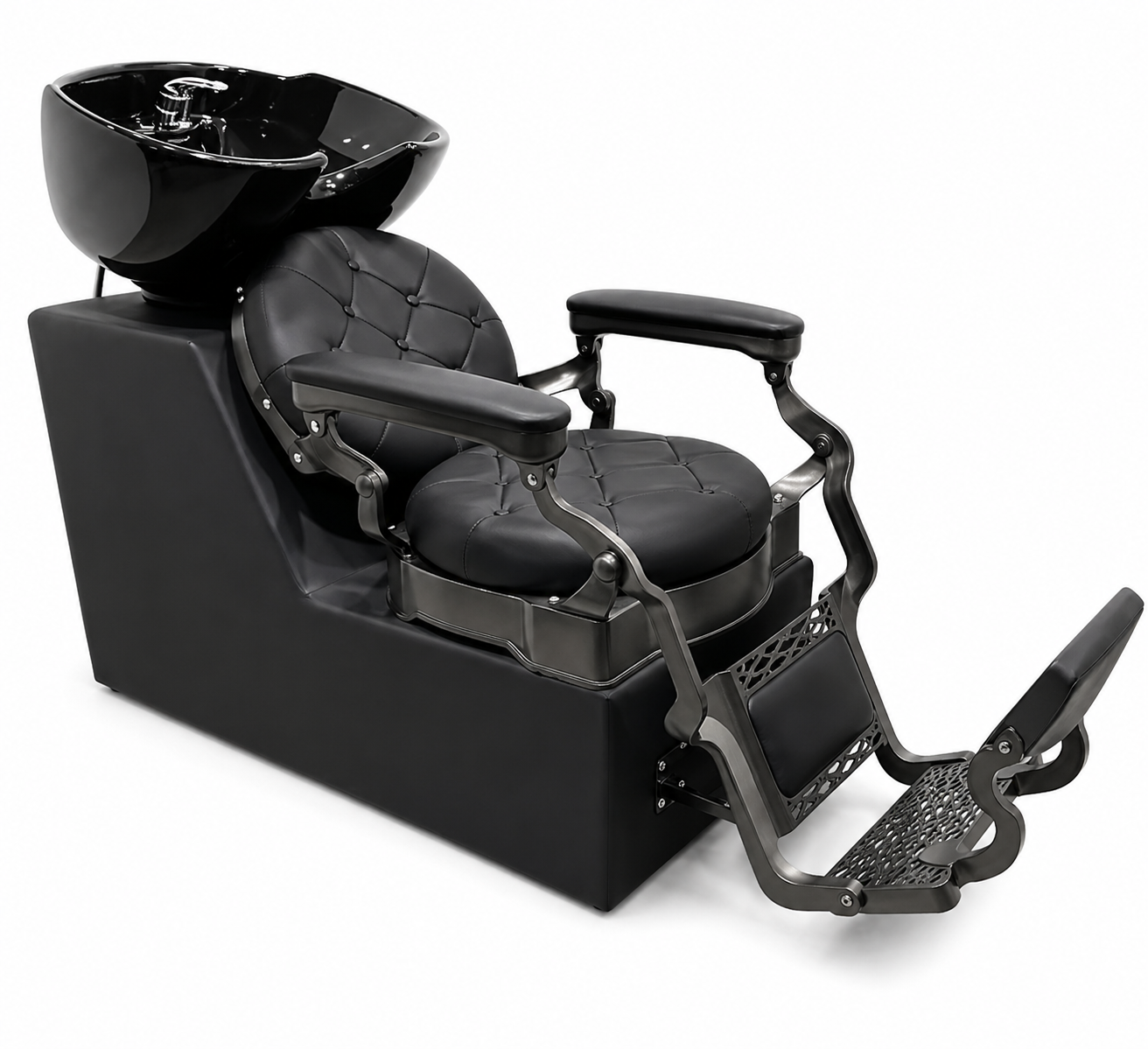 הכיסא מרופד בריפוד איכותי בצבע שחור עם תפירת כפתורים למראה קלאסי, וכולל משענת גב נוחה והדום רגליים ליצירת חוויית שירות מושלמת ללקוח. הכיור המובנה מעוצב בצורה ארגונומית ומתאים לשימוש יומיומי אינטנסיבי.