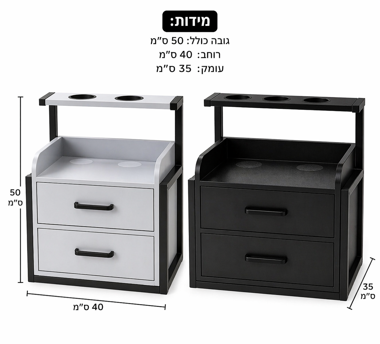 השידה כוללת שתי מגירות אחסון מרווחות, משטח עבודה עליון ומדף עליון עם פתחים ייעודיים למייבש שיער, מכונת תספורת ואביזרים נוספים הנמצאים בשימוש יומיומי.
