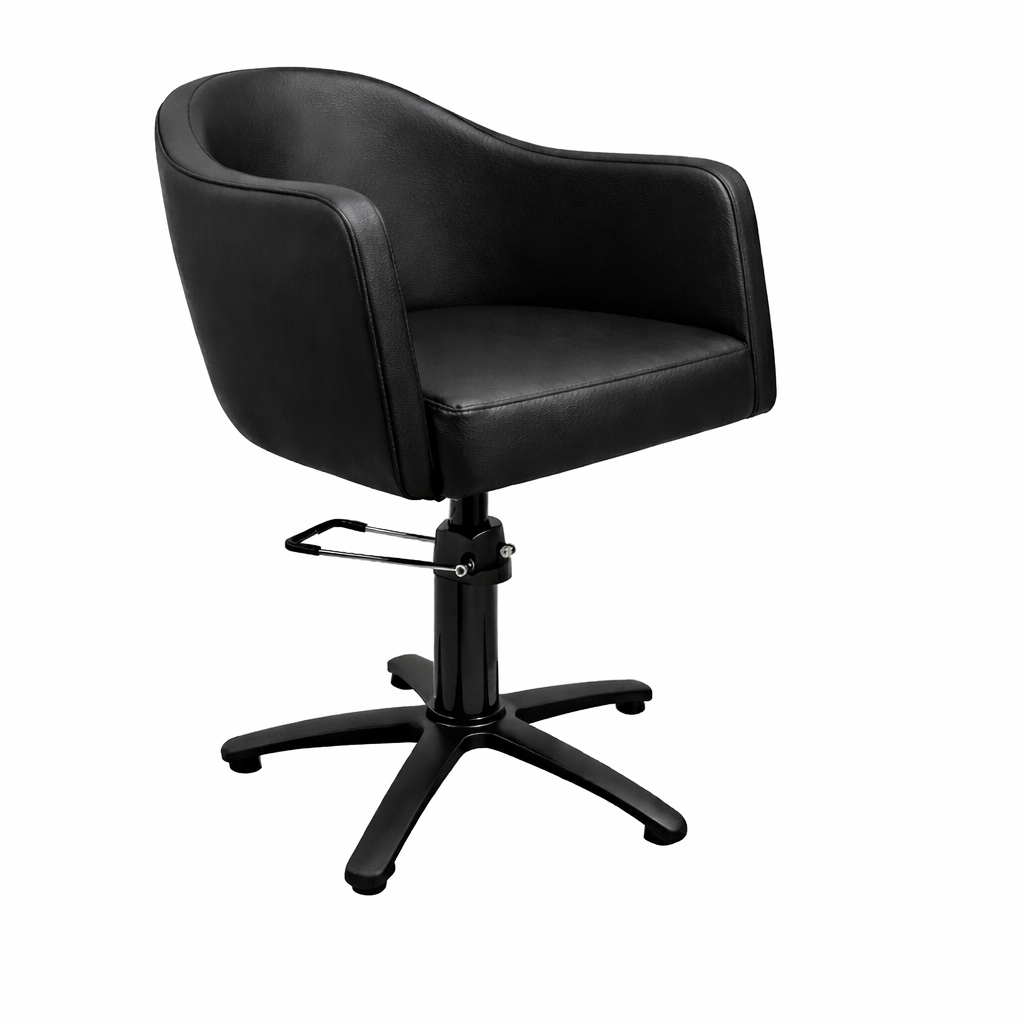 הכיסא כולל גב מעוגל עם משענות יד משולבות, ריפוד שחור איכותי ונוח, ובסיס חזק ויציב המבטיח עבודה בטוחה ונוחה לאורך כל היום. השילוב בין עיצוב יוקרתי לנוחות מרבית הופך אותו לבחירה אידיאלית לכל מספרה מקצועית.