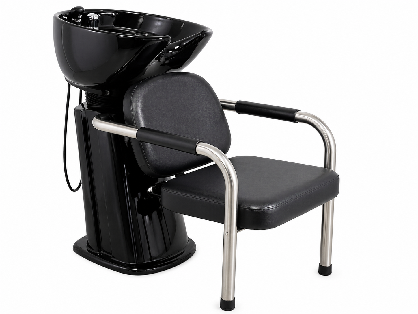 העמדה משלבת כיור חפיפה איכותי עם כיסא ישיבה נוח וריפוד רך, המאפשרים חוויית שירות נעימה ללקוח ונוחות עבודה מקסימלית לספר. העיצוב המודרני בצבע שחור עם ידיות בגוון כסף מעניק מראה אלגנטי ונקי המשתלב בקלות בכל חלל.